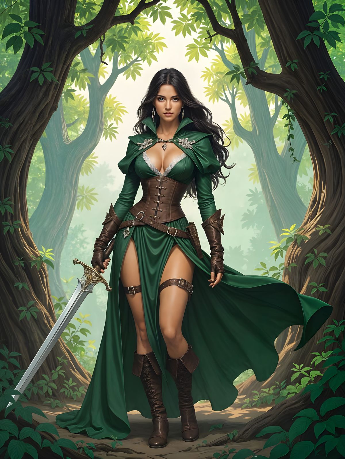 A captivating image shows a confident young woman, the Princess of Thieves, in a sun-dappled forest. She wears emerald green and silver, blending elegance with practicality, in a fantasy art style.