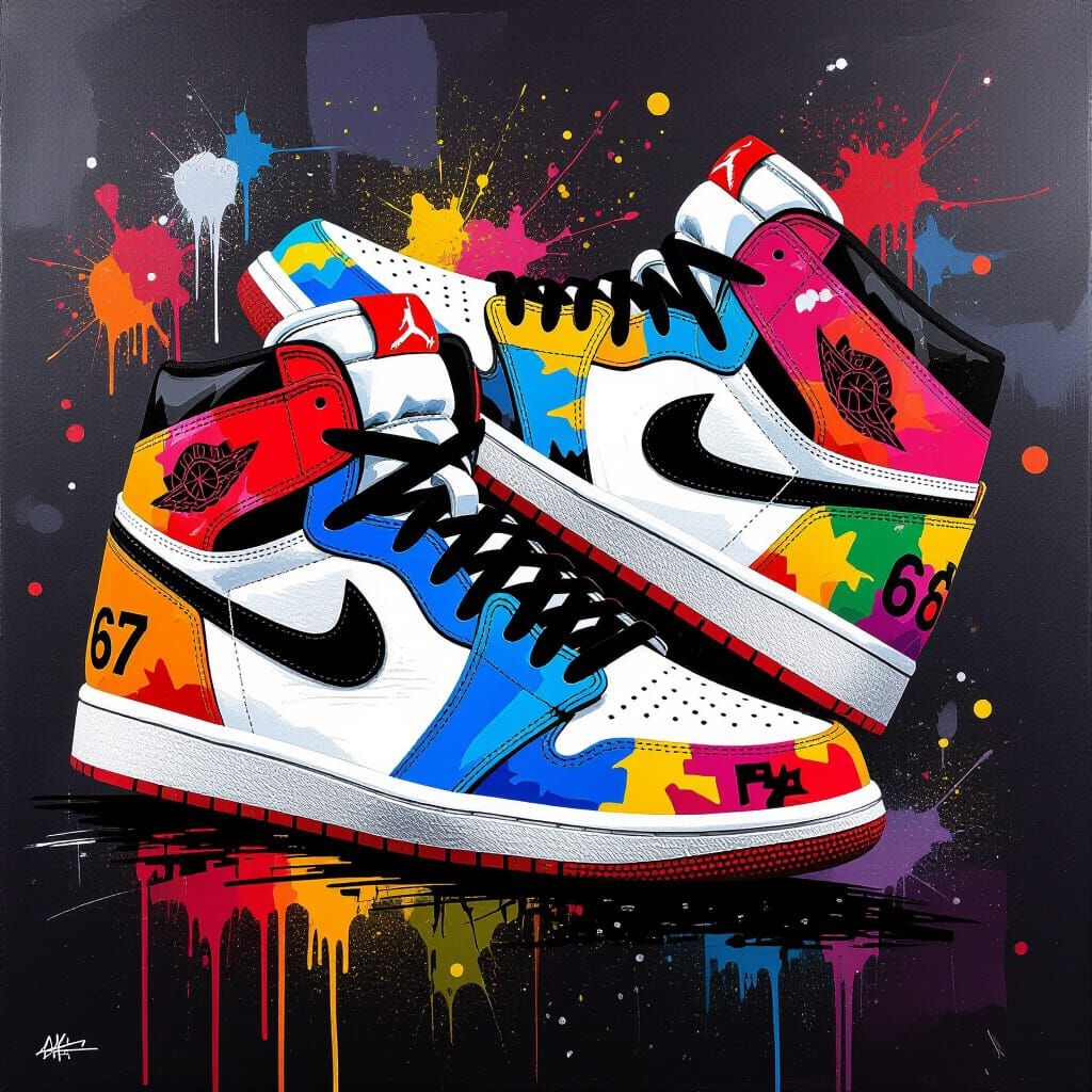 This image features Air Jordan sneakers splashed with the number "67" and a chaotic, vibrant color explosion in a graffiti art style. Inspired by street art, it uses bold strokes and high contrast.