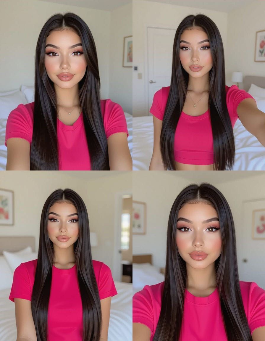 This image captures a Gen Z Latina teen's Instagram selfie. She has petite features, sleek black hair, and bold makeup, wearing a hot pink shirt in her bedroom.