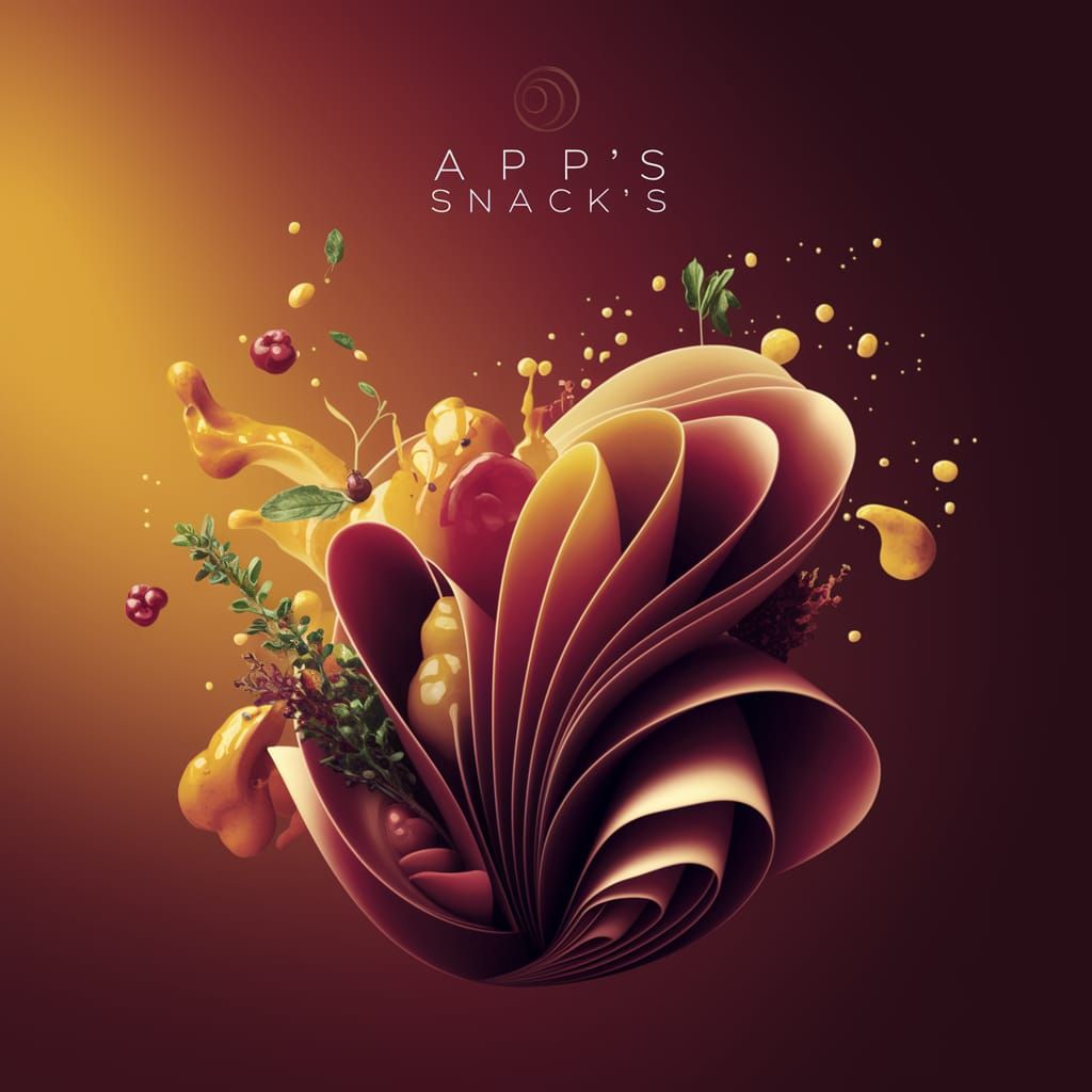 This image showcases a vibrant, abstract representation of gourmet cuisine, featuring swirling patterns of rich sauces and spices, with subtle hints of herbs and exotic fruits. A warm, golden background and elegant typography evoke a sense of sophistication and creativity.