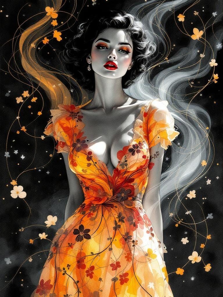 A striking picture of a Russian woman in traditional dress. The image blends Art Nouveau elements with subtle ink wash techniques, creating a vintage aesthetic with dramatic lighting and fluid lines.