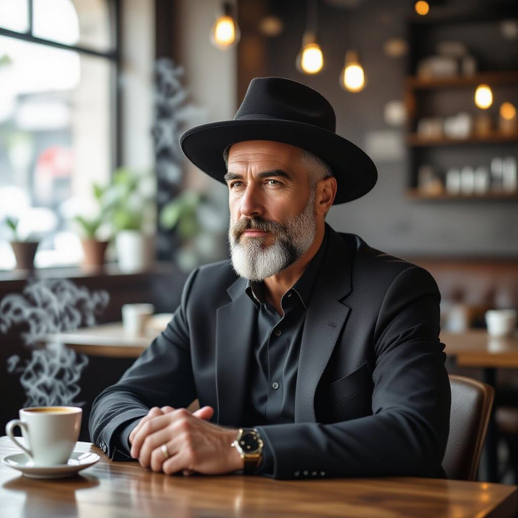This image depicts an old, wise, and mysterious man in a modern, charismatic style, sitting at a table in a dimly lit environment with smoke and mystic light. The art style is surreal and dreamlike.