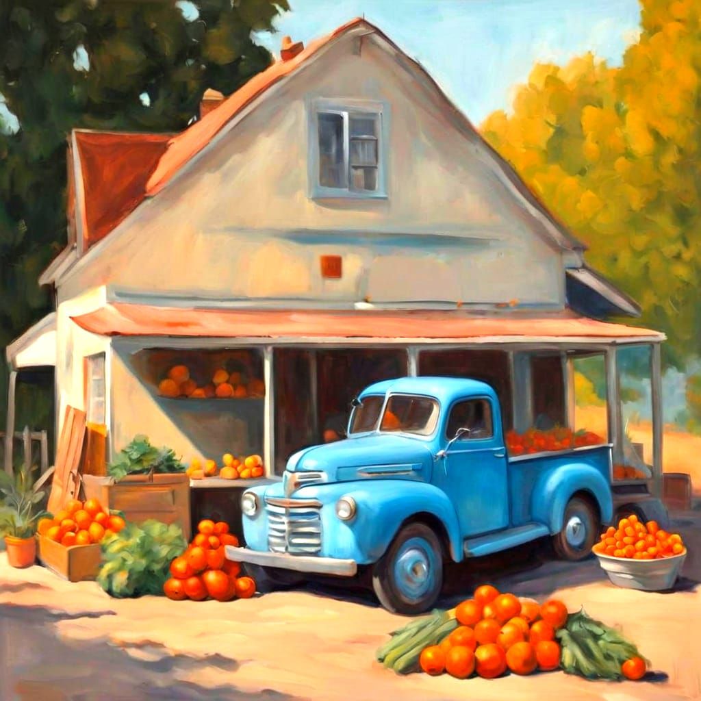A striking picture of a sun-drenched farmstand overflowing with colorful fruits and vegetables, with a vintage blue truck nearby. The painting style evokes nostalgic Americana with soft brushstrokes and warm colors.