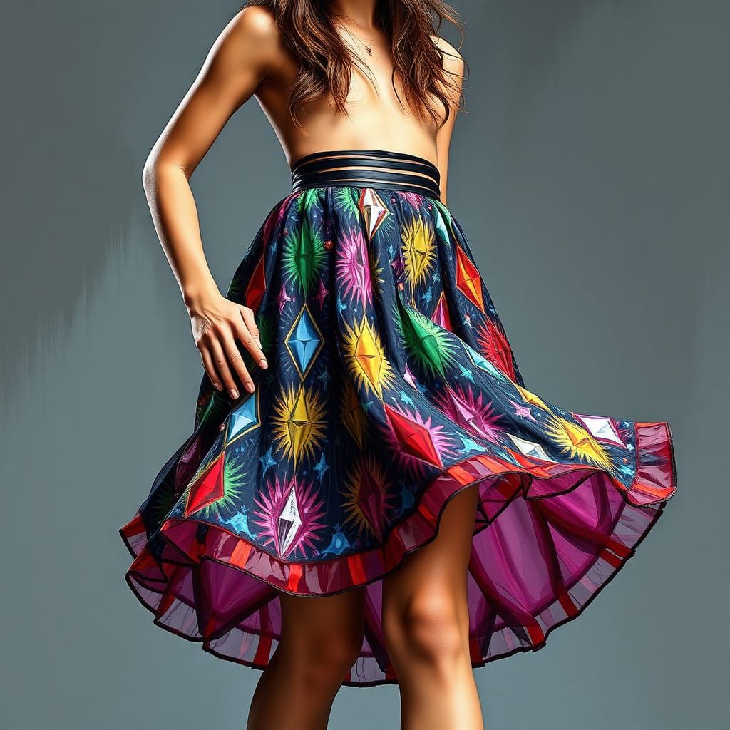 This image shows a young woman in a bold, diamond-encrusted fashion skirt, set against a vibrant and colorful background, created in an impressionist style with great attention to detail.