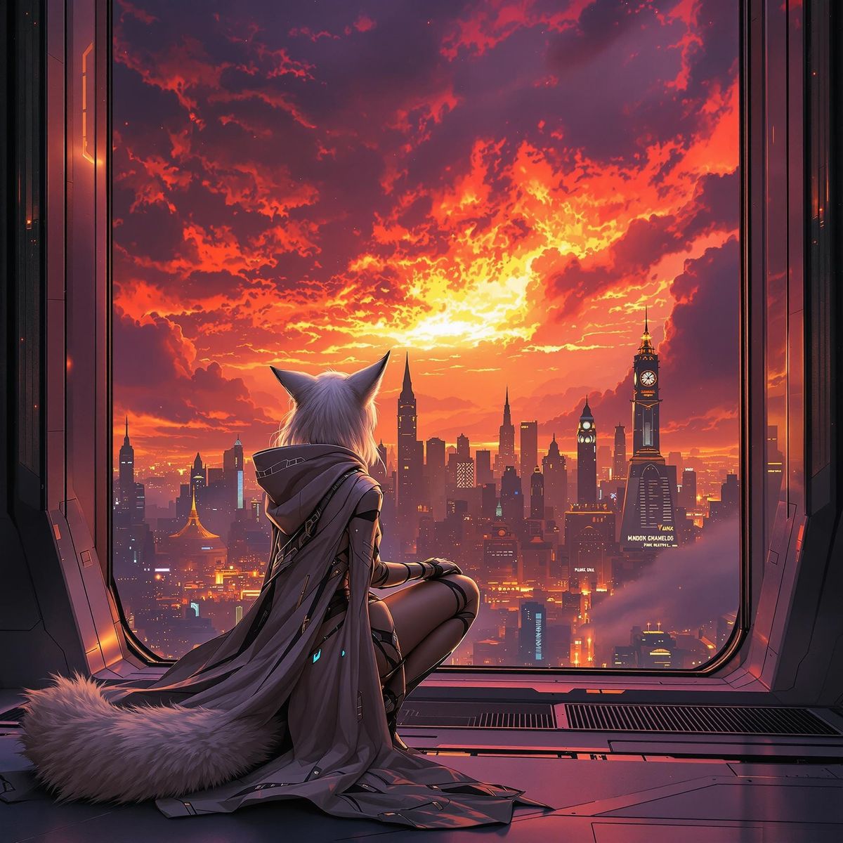 A stunning image of a fox girl in a high-tech room, gazing out at a tempestuous cityscape beneath a deep crimson sky. Rendered in exquisite detail, with a blend of futuristic and fantasy elements, this dark science fiction artwork features dynamic lighting and an Art Nouveau flair.
