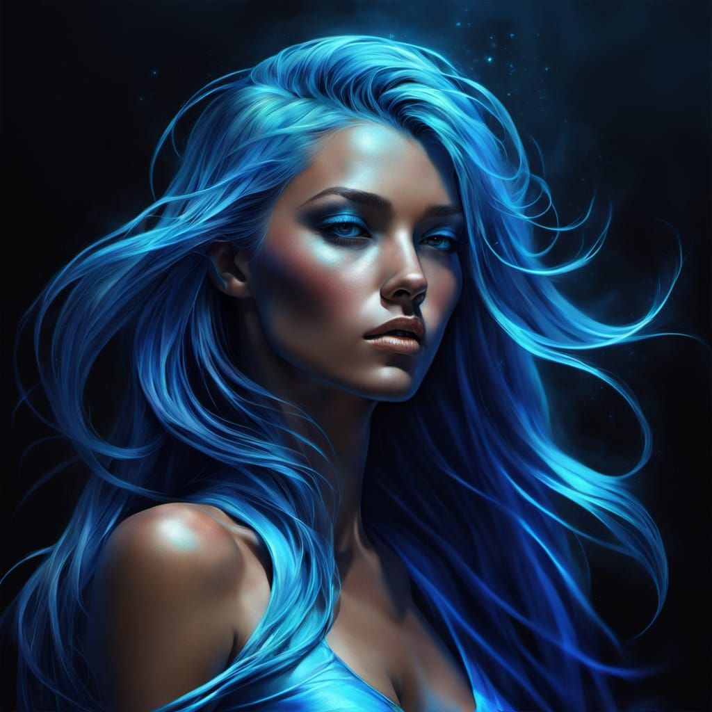 A vibrant image of a woman with long, flowing blue neon hair in a neo-futuristic style. Her skin has a satin sheen, reminiscent of sea views, rendered in a Bogle-esque aesthetic.