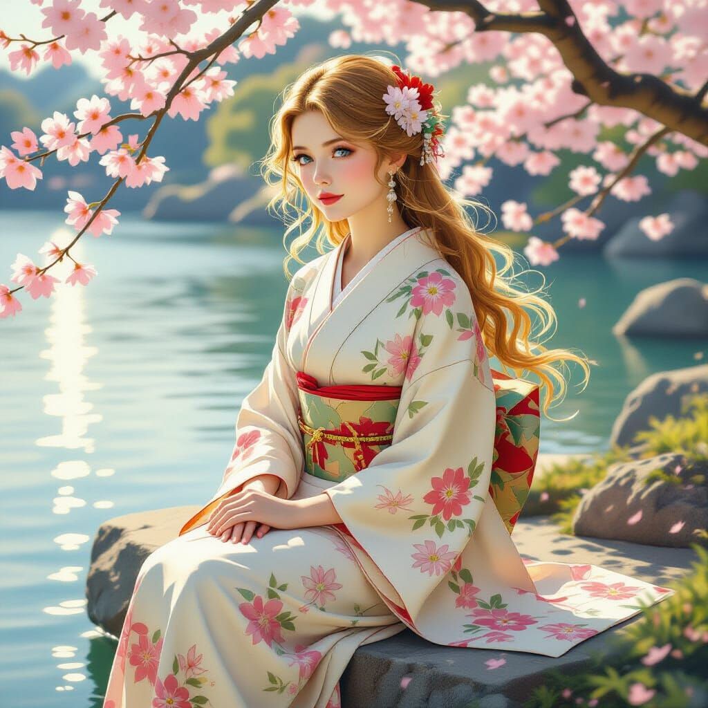 This image shows a beautiful woman with flowing golden hair sitting near water. She is wearing a floral kimono and is surrounded by blossoms in an ethereal art nouveau style.