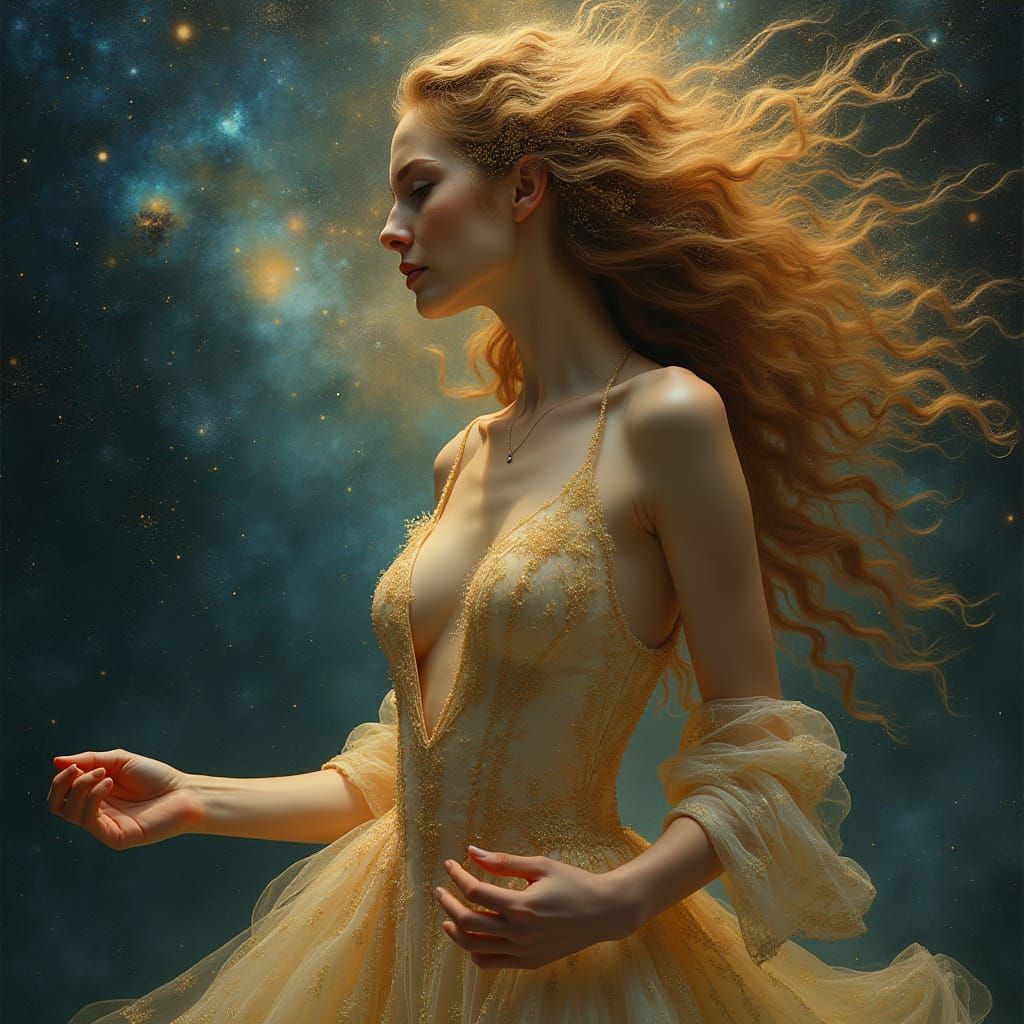 A captivating woman with nebula hair poses against a galactic backdrop. This artwork features flowing lines, cosmic elements, and a color palette of golds and deep blues, inspired by art nouveau.