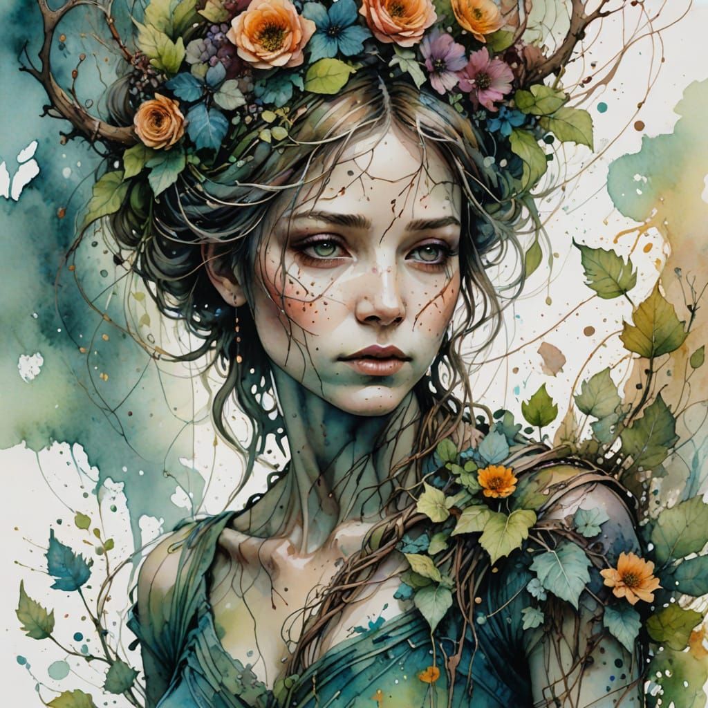 A striking picture of a stoic, gender-neutral guardian with arms outstretched. This watercolor image features fine ink details, delicate vines, and expressive splatters. Soft light and muted seasonal colors create an ethereal, botanical aesthetic.