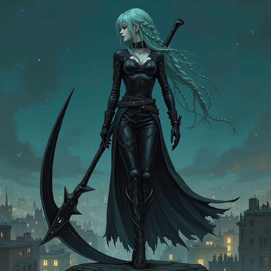 This image shows a tall, slender woman with teal hair, clad in spiked black leather and steel-toed boots. She is on a rooftop at night, holding a double-bladed scythe in a dark fantasy aesthetic.