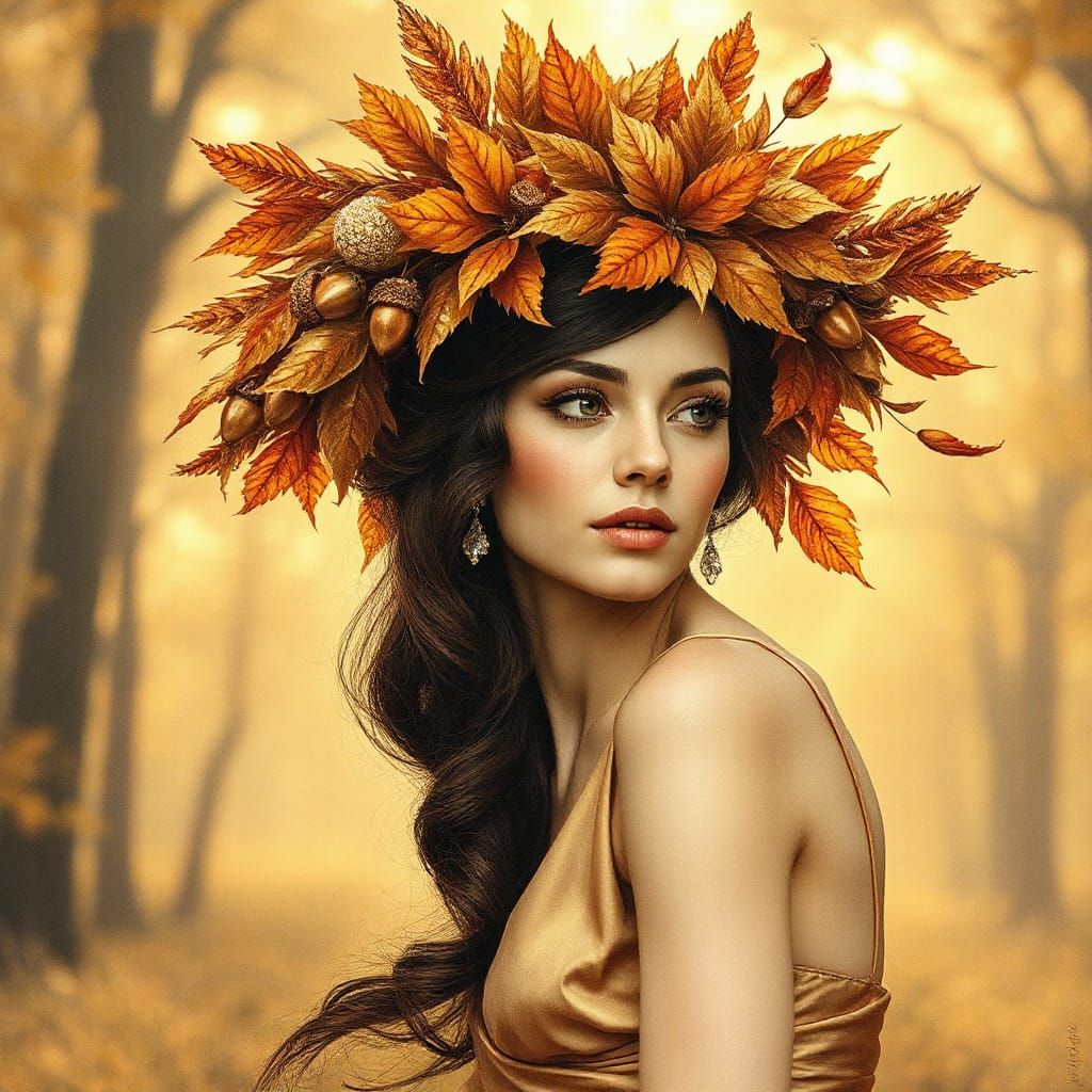 This image depicts an elegant woman wearing a flowing crown-shaped hat made of shimmering autumn leaves, golden feathers, and silk. Rendered as a charcoal and colored pencil illustration with soft shading and metallic highlights.