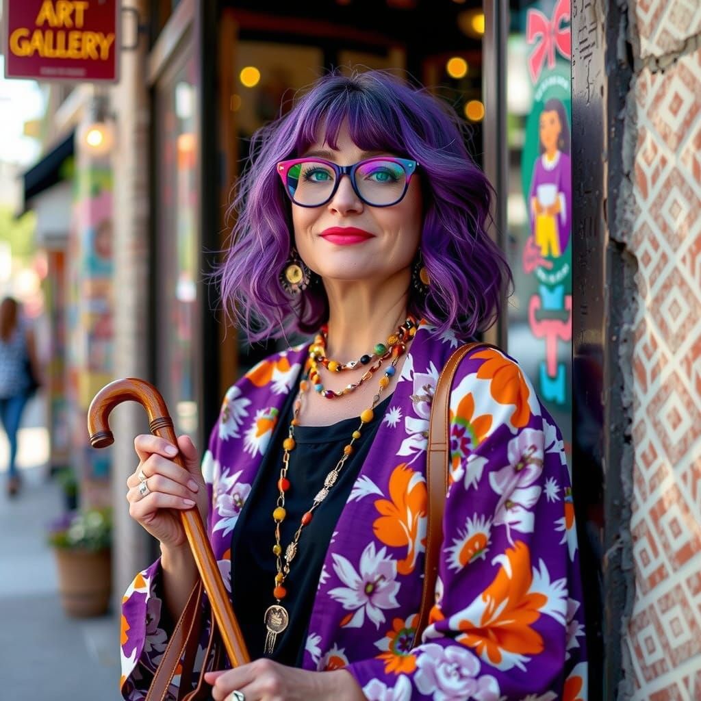 This image shows a stylish middle-aged woman with purple hair and cat-eye glasses standing outside an art gallery. The scene is reminiscent of 35mm film stills with a warm, nostalgic aesthetic.