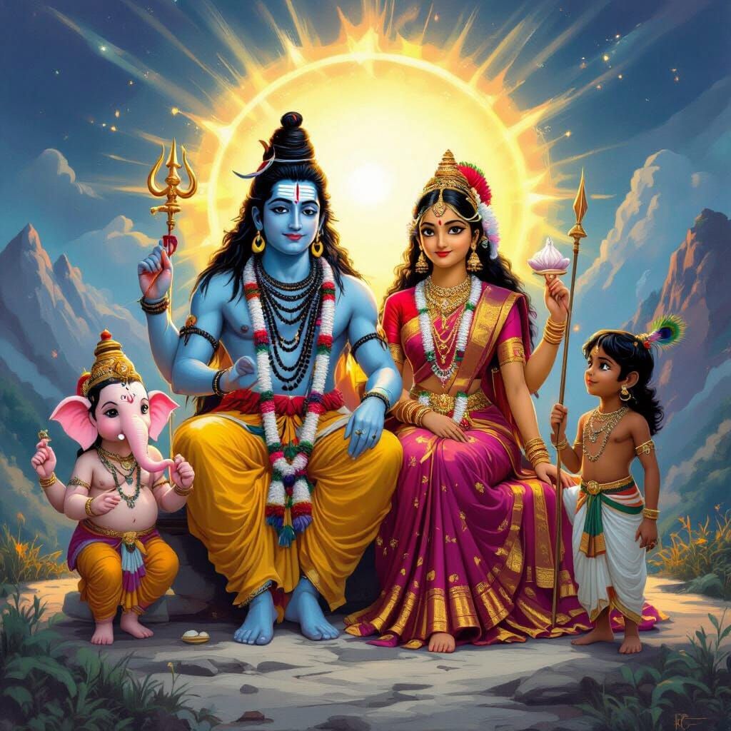 Generate unique images of Lord Shiva, Parvati, and Ganesha in various styles with our free AI image generator.