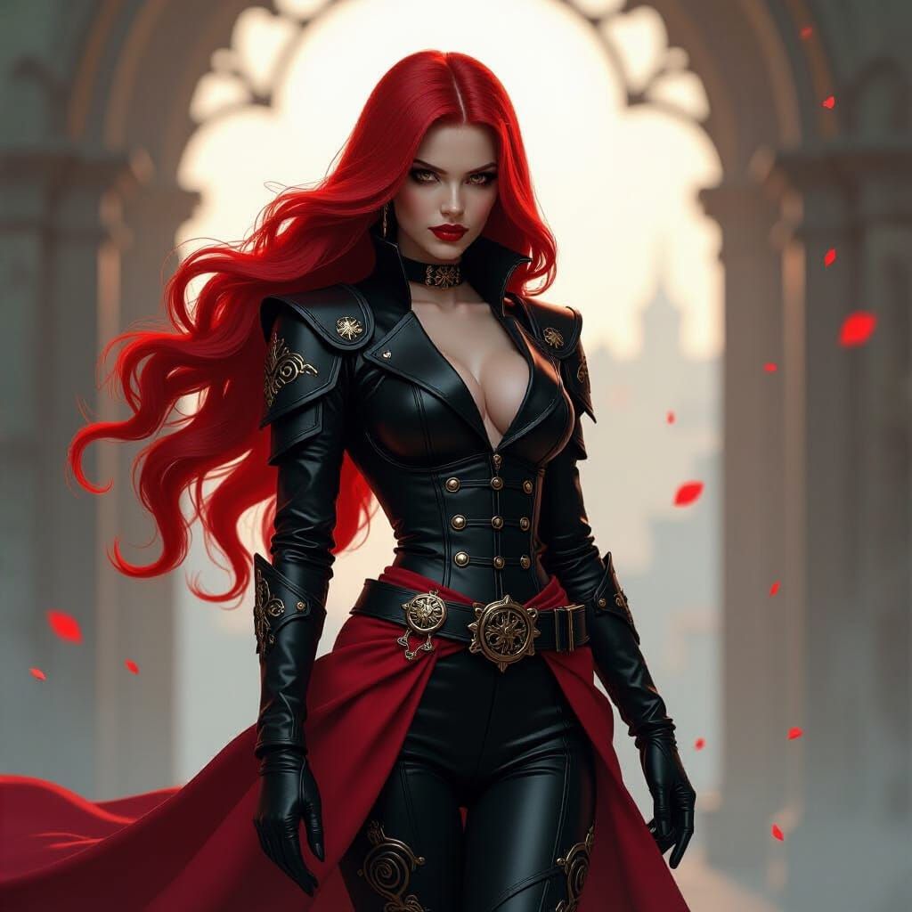 This image shows a Tiefling woman with long red hair in a dramatic pose. She wears a black suit with shoulder armor and a red skirt, set against a blurred background with floating particles. The image is rendered with intricate details and atmospheric lighting, in a vibrant fantasy style with industrial ...