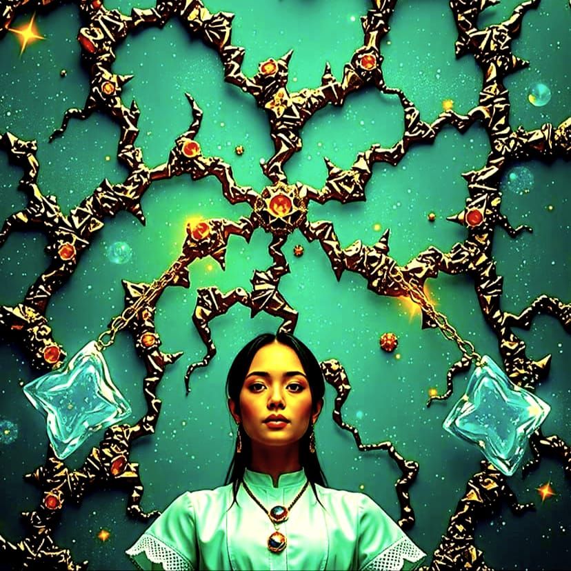 This image shows a photorealistic woman silhouetted against a vibrant, deep starry night sky. Iridescent colors ripple across her skin, illuminated by a golden glow in this vivid digital art piece.