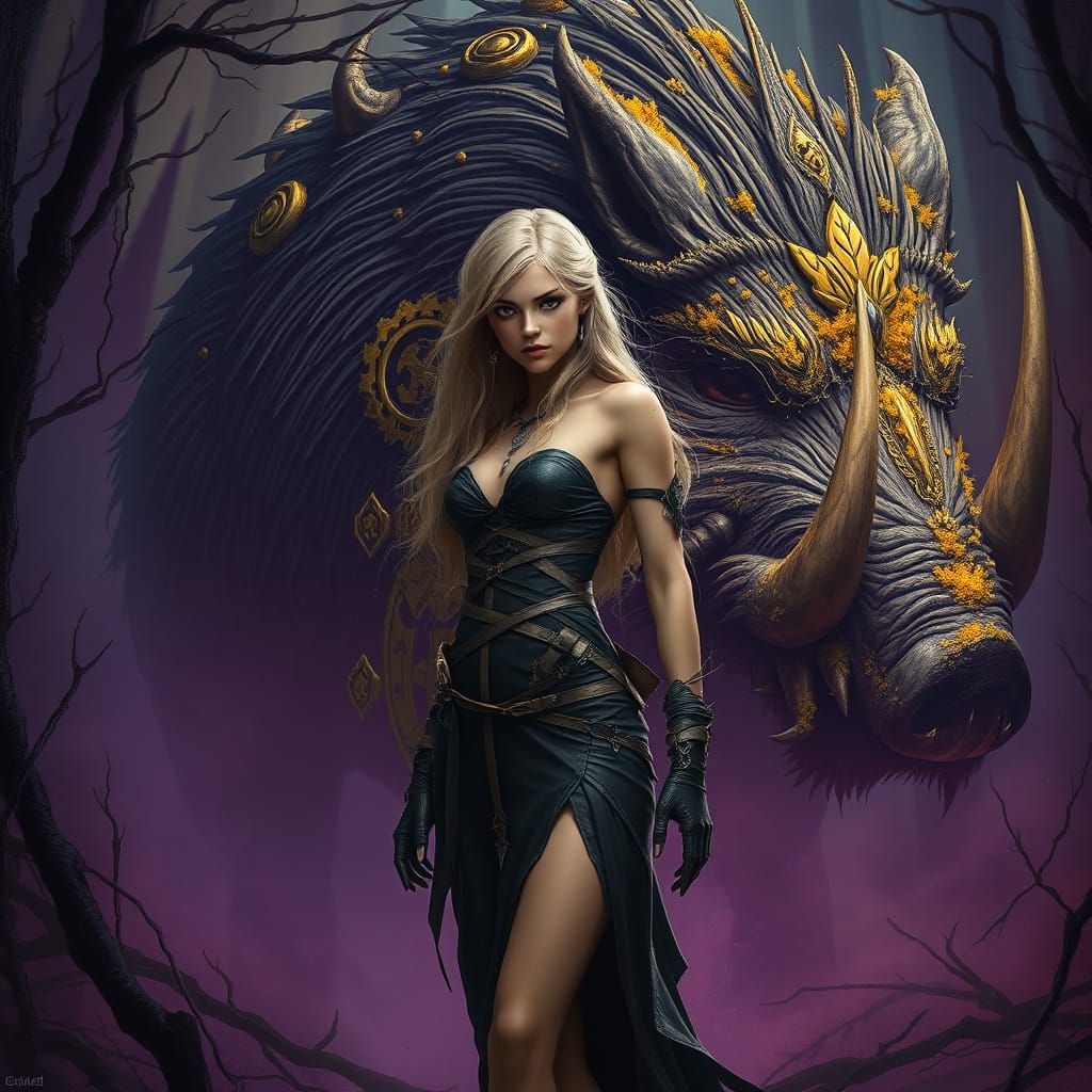 This image shows a slender blonde woman in a ripped dress, set in an unsettling environment. A large, moss-covered boar appears in the background, rendered in a dark fantasy style with rich, deep colors, reminiscent of digital art.