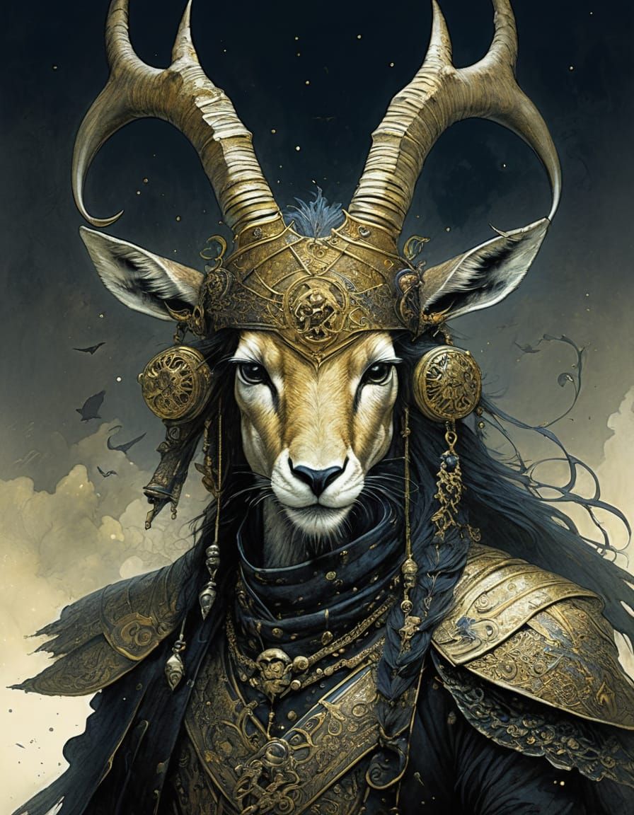 A highly detailed image of an anthropomorphic gazelle pirate. The artwork evokes the intricate linework and fantastical character design of surrealist illustration.