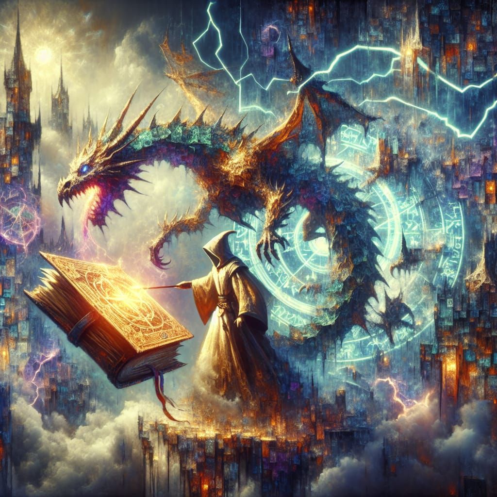 A dramatic image shows a dracolich raiding a haunted castle. The scene, reminiscent of classic role-playing games, includes a spell-casting character, an ancient tome, and a magical portal. The picture is rendered with pre-1912 artistry and a banana mania color palette.