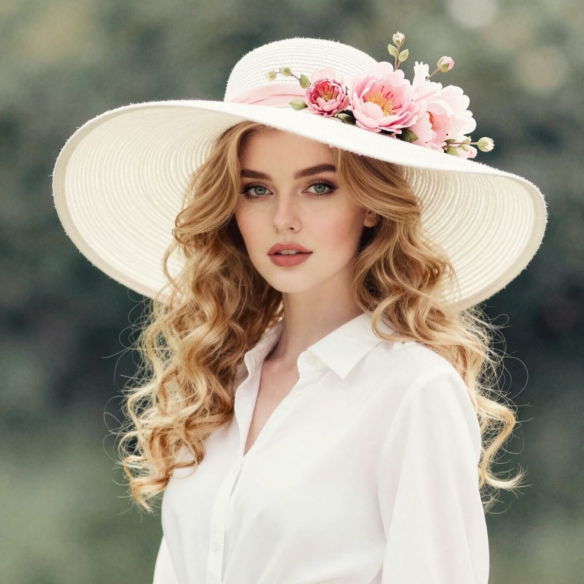 This image shows an elegant woman with curly blonde hair, wearing a large white hat adorned with pink flowers and a white shirt. Rendered in a soft, watercolor style with gentle colors.