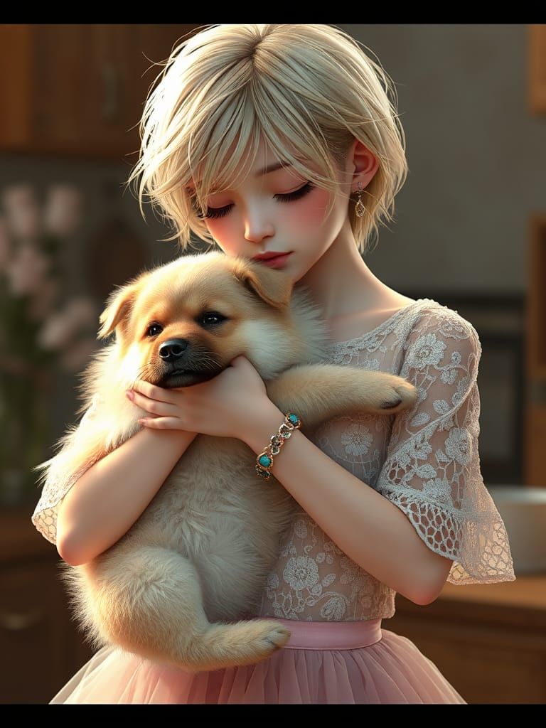 A heartwarming image of a young Slavic girl embracing a fluffy dog, eyes closed in affection. The image is rendered in a vibrant 3D anime style, with ultra-detailed textures and dreamy concept art shading.