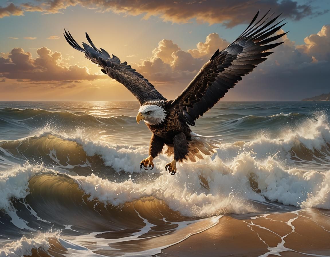 A vibrant image of a baby eagle soaring above the ocean. The artwork features soft textures, dynamic lighting, and intricate details, rendered in a photorealistic splash art style.
