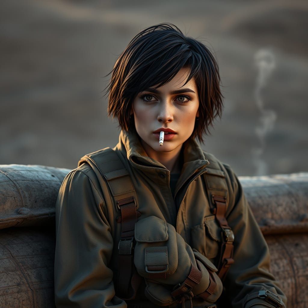 A gritty, cinematic portrait of a battle-hardened Russian paratrooper, clad in worn, earthy tones, with a cigarette dangling from her lips, set against a weathered sandbag wall, radiating determination and exhaustion.