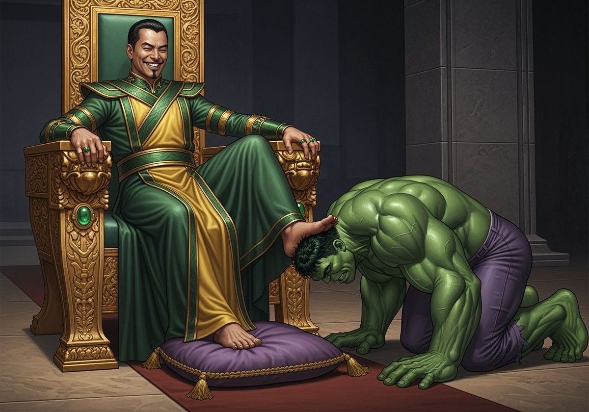 This image shows the Marvel villain Mandarin seated on a throne of gold and emeralds. The Hulk kneels before him, with Mandarin's foot pressing down on his head. This scene is rendered in hyperrealism.