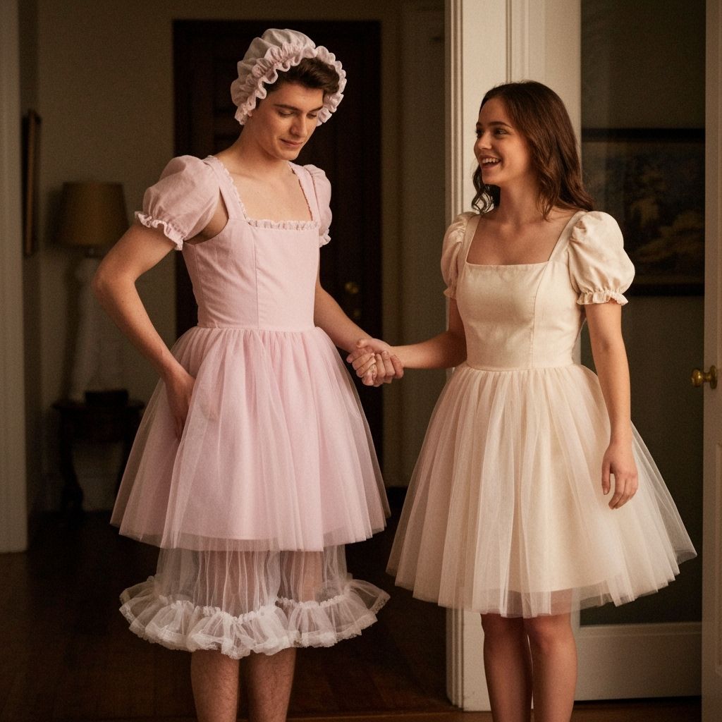 Cinematic film still captures a worried young man in a ruffled bonnet and tulle dress, curtsying to his girlfriend. Filmed with cinematic lighting and natural grain for an atmospheric feel.