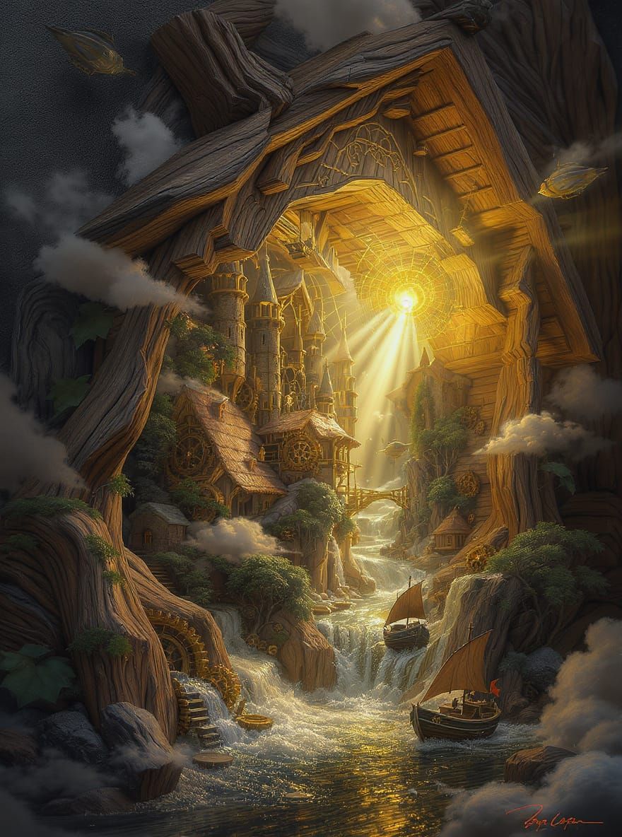 A highly detailed steampunk cuckoo clock reveals a miniature castle and village, with airships and cog-powered boats. Features soft, dramatic lighting and intricate textures.
