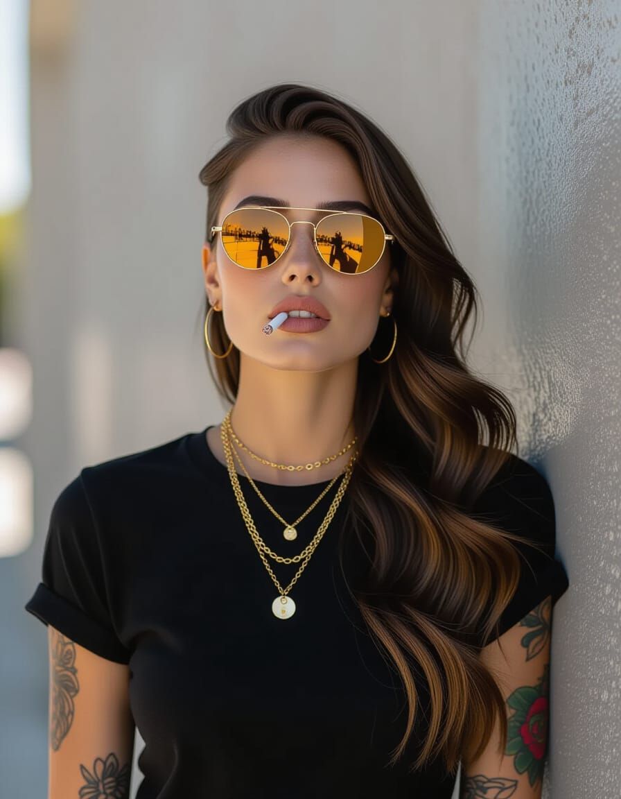 A striking picture of a woman with a shaved head and tattoos, posing with a cigarette. The image has a gritty, film-like aesthetic and a neutral color palette.