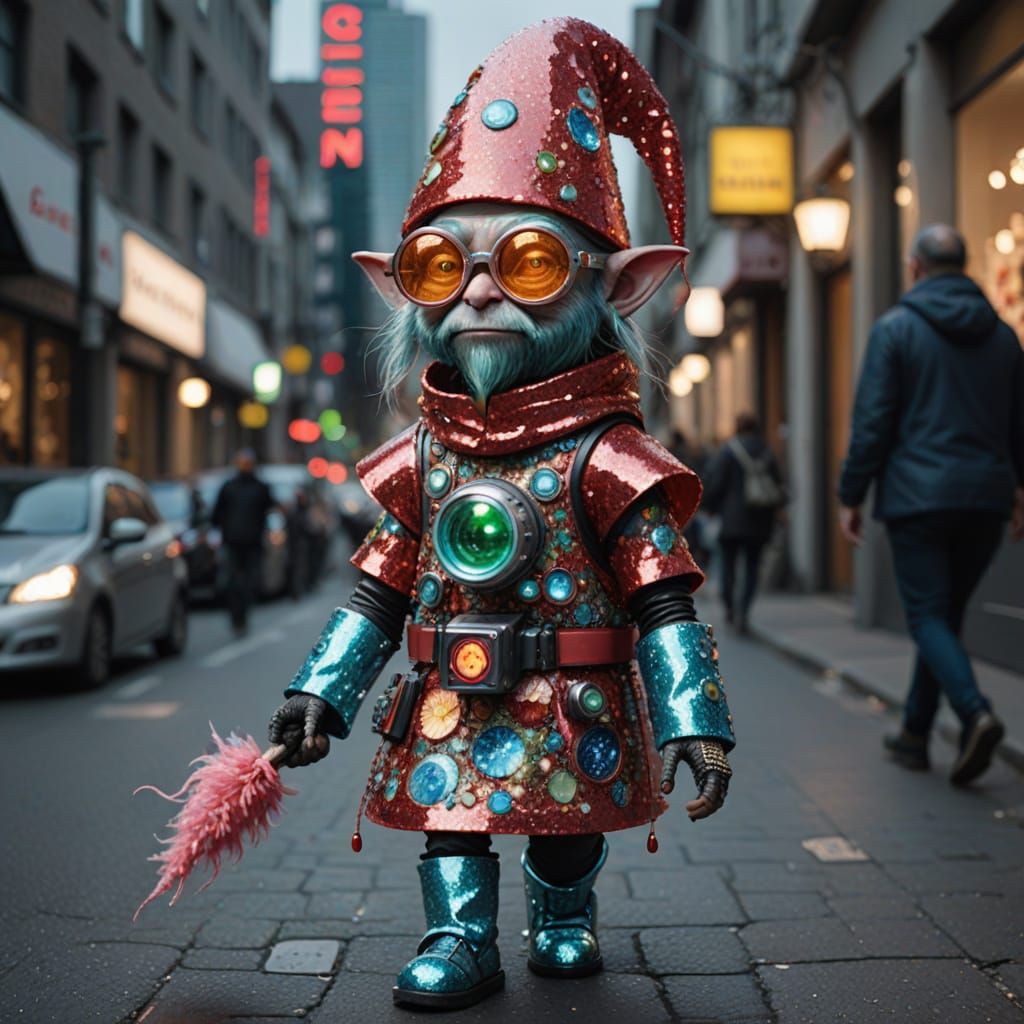 This image depicts a high-fashion gnome model, inspired by Bosch's art style, strutting in a shimmering sequined dress and glowing goggles, accompanied by a pet rhubarb.