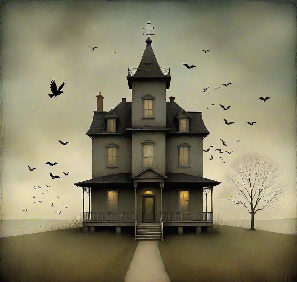 This image is a dark fantasy world with twisted architecture and eerie landscapes, reminiscent of Tim Burton's signature style, featuring gothic and whimsical elements.