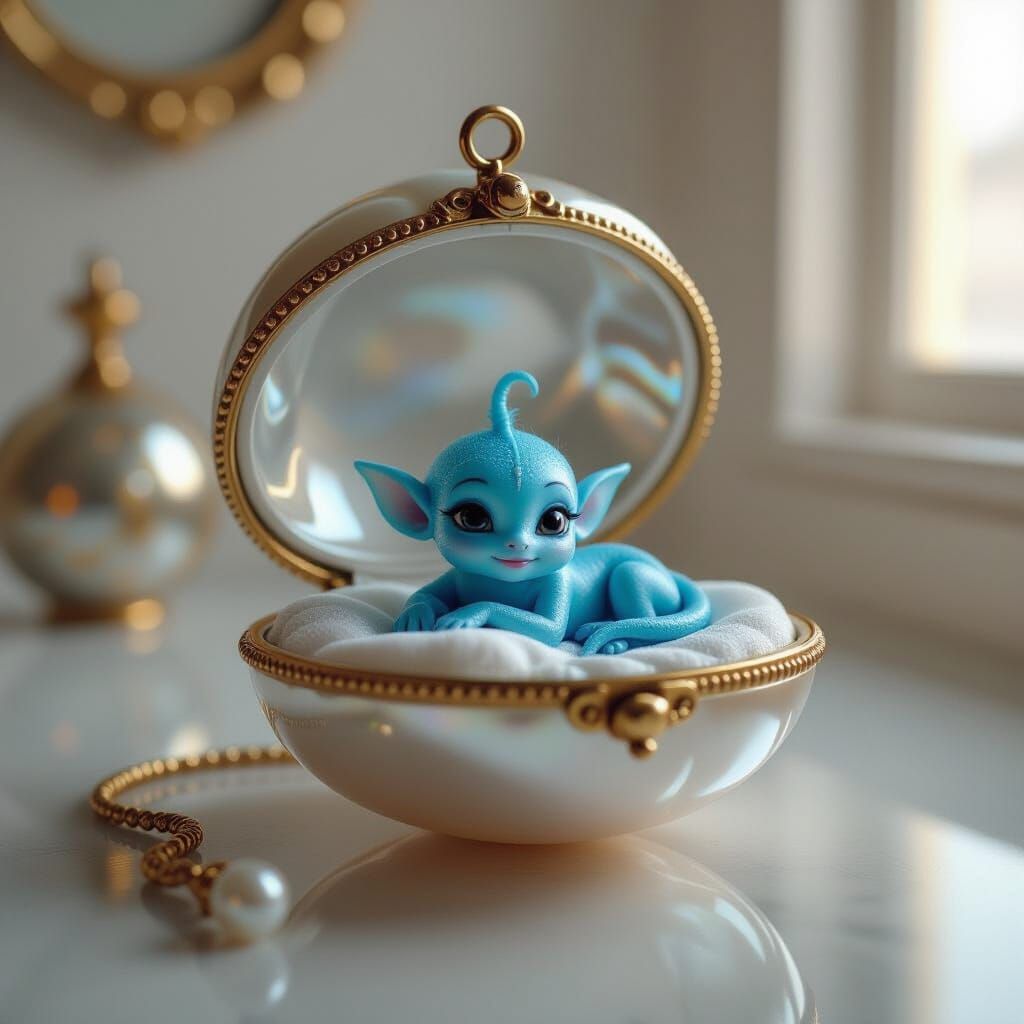 a tiny miniature world inside an open pearl medallion, ultra-detailed macro photography style, a tiny tidy studio apartment room with a tiny jinn resting, mix of glassy, real textures with realistic reflections, shallow depth of field, bokeh background with soft natural lighting, photorealistic render ...