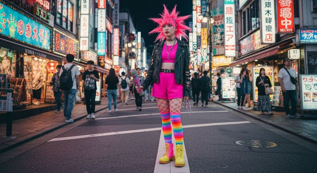 This image shows a punk gyaru girl with bright pink hair in Okinawa. The Shibuya and Harajuku-inspired scene is filled with neon lights and vibrant street art, in a kawaii aesthetic.