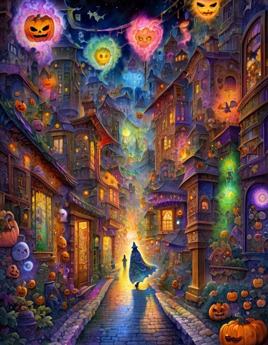 This image shows a samurai ghost with glowing eyes walking through decorated Halloween streets. The art style features intricate lineart, detailed brushstrokes, and a blend of watercolor, ink, and vivid colors for an ethereal, surreal mood.