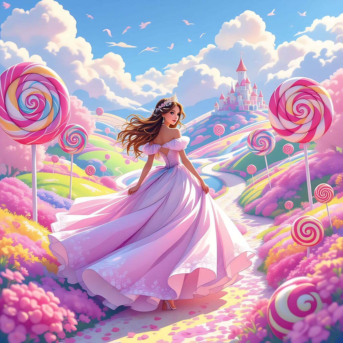This image shows a princess in a candy land, complete with lollipop trees and gumdrop hills. The scene is rendered in bright neon colors with a dreamy, vibrant aesthetic, in a fantastical anime style.