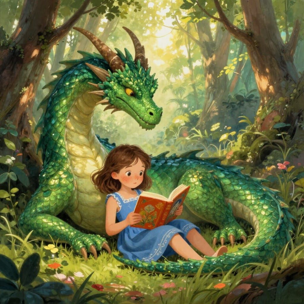 This image shows a young girl in a blue dress reading a storybook to a large, emerald-scaled dragon in a sun-dappled ancient forest. Created in a fantasy illustration style with painterly textures and vibrant colors.