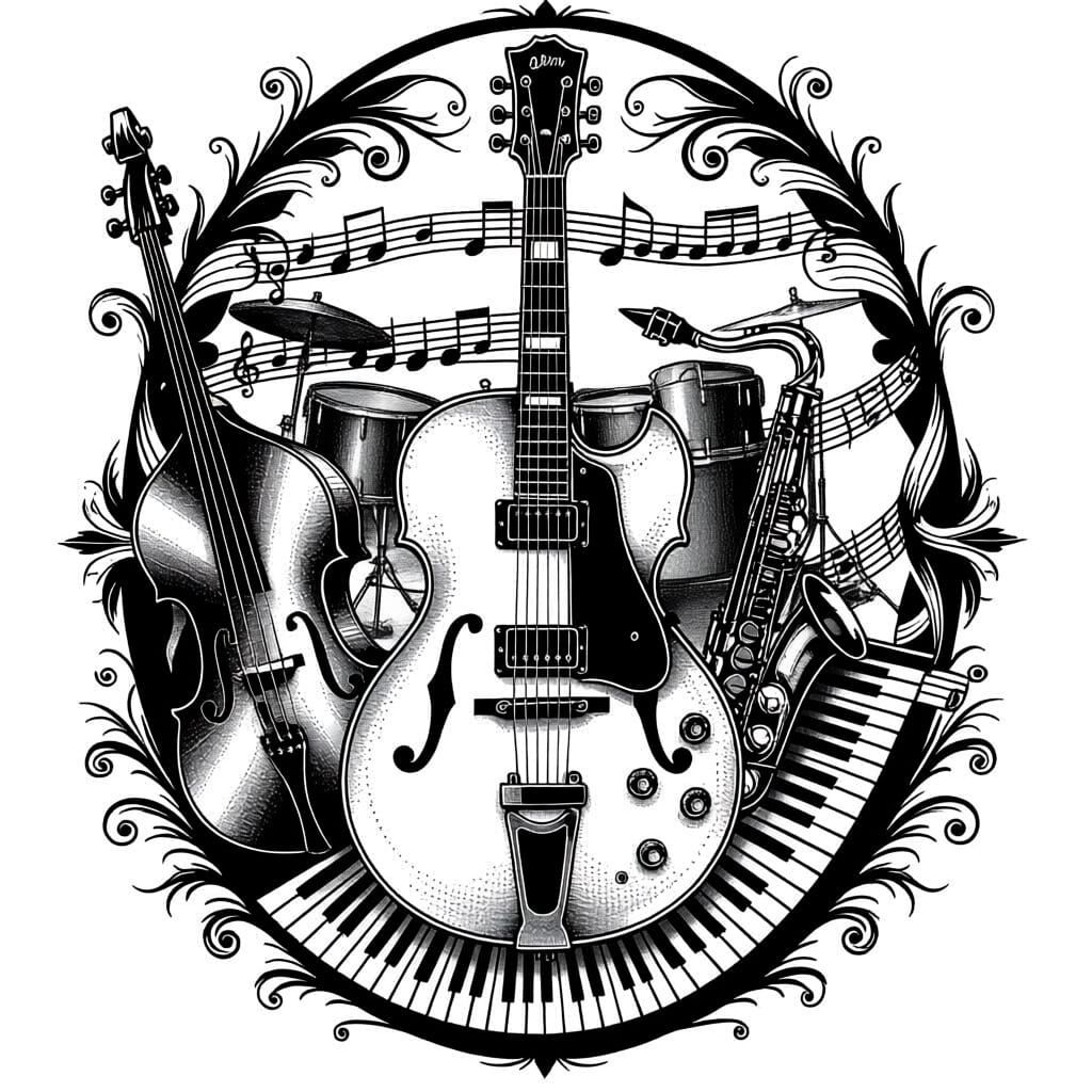 This black and white oval tattoo concept features a jazz guitar at its center, surrounded by a double bass, drums, saxophone, piano keys, and sheet music.