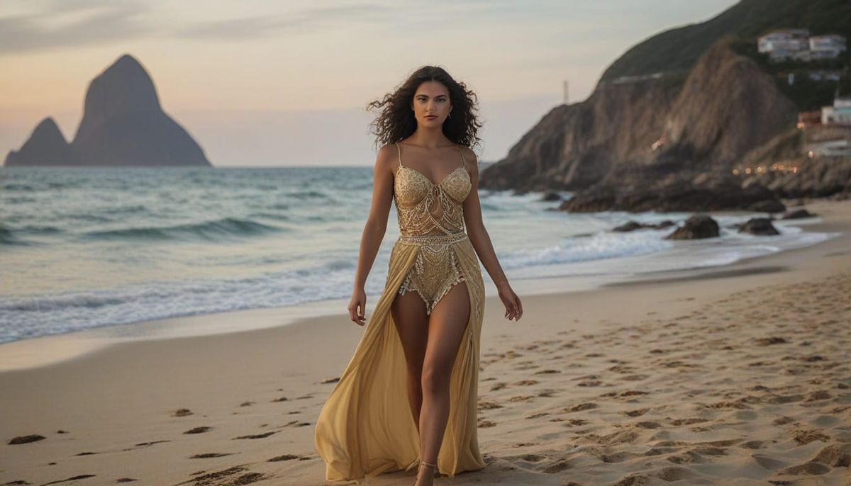 A full-body, realistic cinematic portrait of a beautiful Brazilian woman walking in Copacabana. Features her with long, wavy black hair, fine jewelry, and a modern, vibrant look.