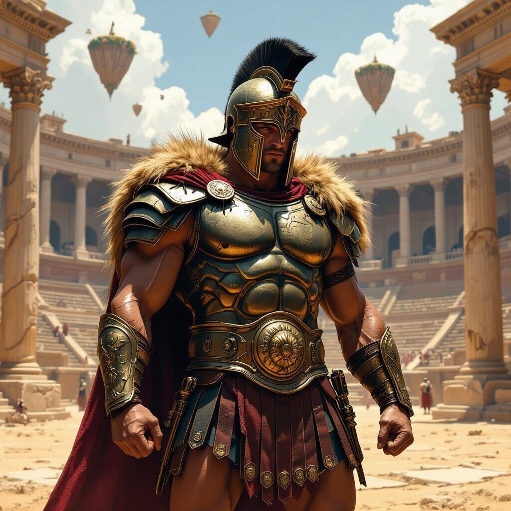 This image shows a muscular gladiator in bronze armor standing in a sunlit arena. The scene features dramatic lighting and rich colors reminiscent of hyperrealistic digital art, with a touch of ancient Roman architecture.
