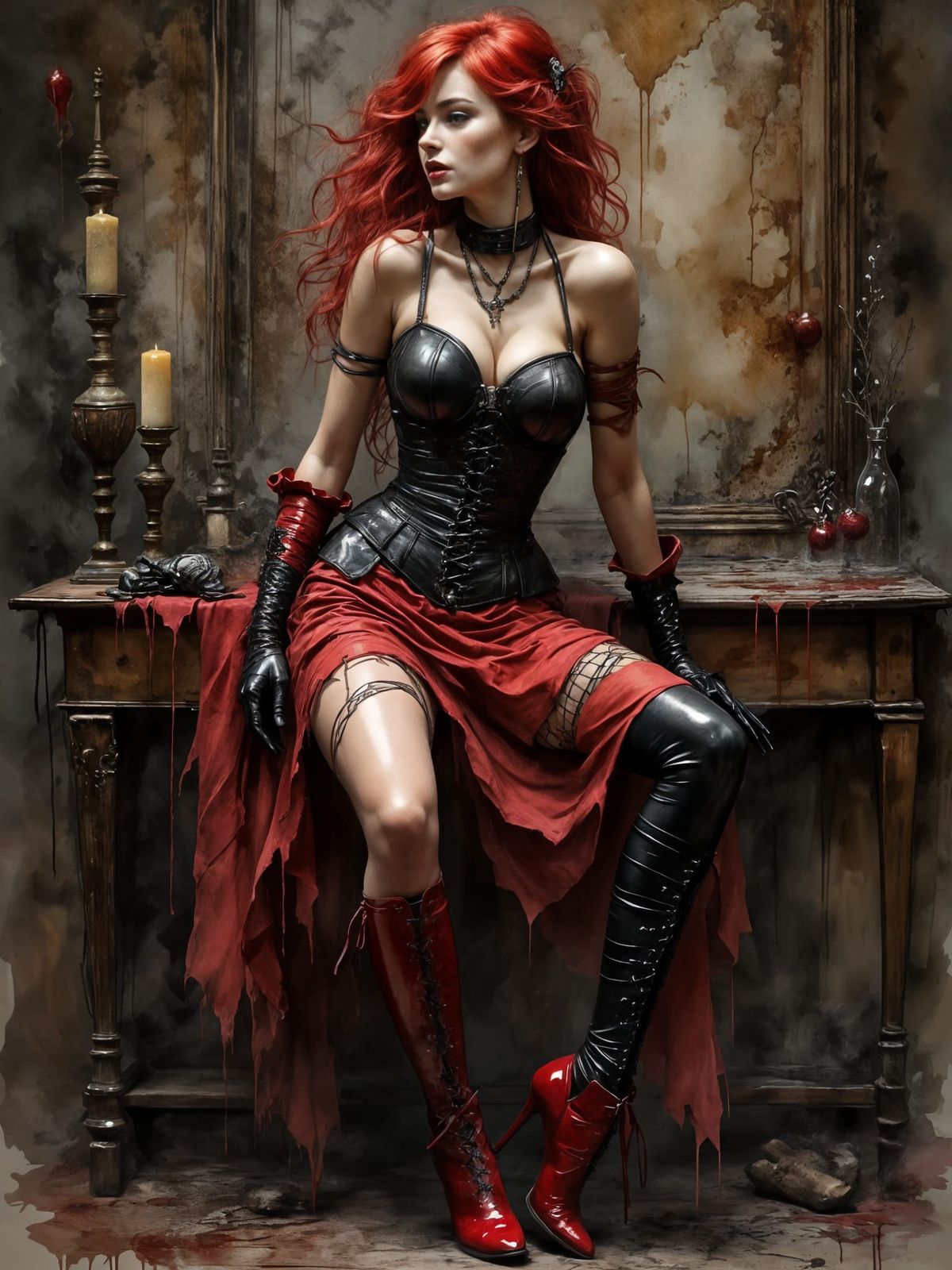 A full-body portrait of a beautiful redhead woman in a retro pinup style, wearing a leather corset, short skirt, and high-heeled boots, rendered with intricate detail.