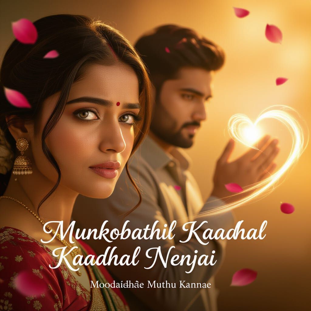 A cinematic portrait of a South Asian woman with pearl eyes, conveying quiet anger and distant longing. Warm golden light illuminates her face, with a symbolic figure reaching out in the background.