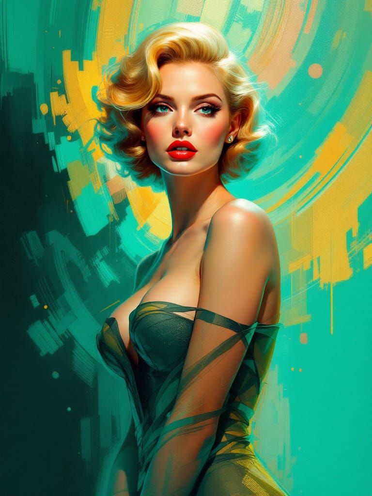 A hyper-stylized digital portrait of a 1950s pin-up woman with bold eye contact, featuring smooth gradients, abstract streaking, and vibrant colors in turquoise and gold, with visible brushwork.