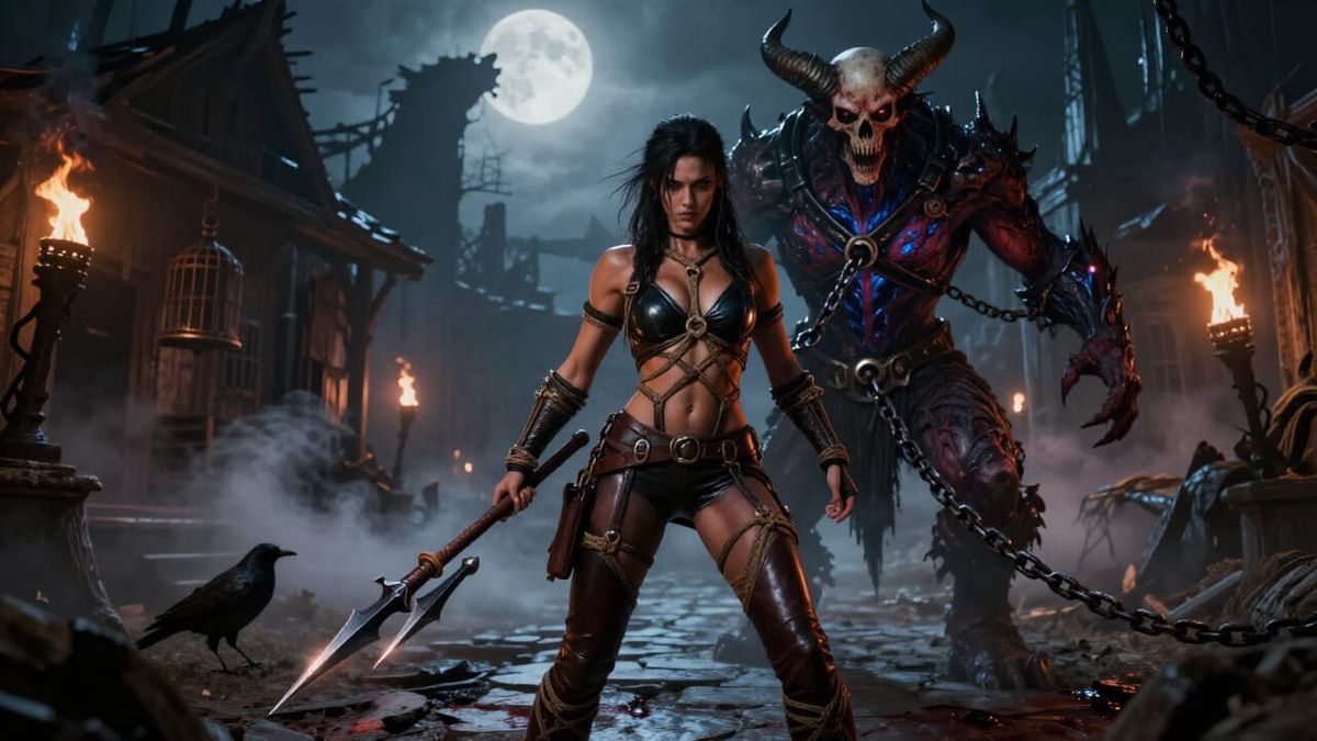 This cinematic dark fantasy image depicts a realistic scene in the haunted ruins of Tristram. A determined Amazon warrior, clad in latex and leather, faces the demonic Prime Evil Baal under cold moonlight.