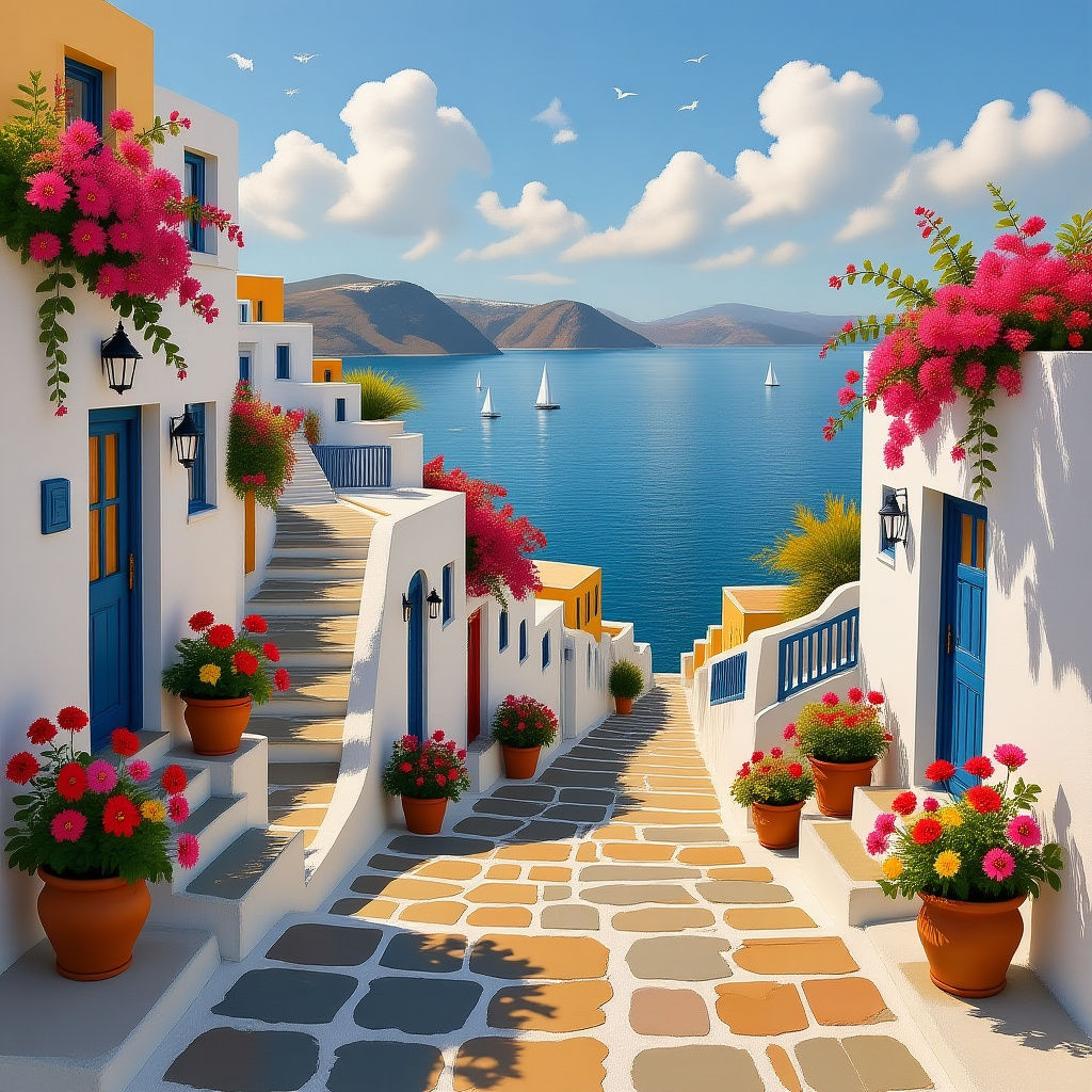Create your own sun-drenched Mediterranean coastal village scenes with our free AI image generator.