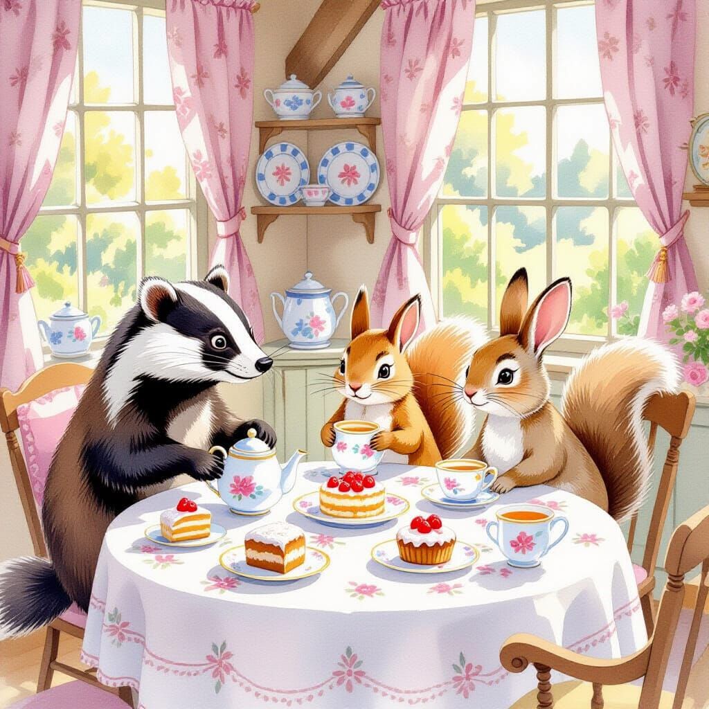 A charming image of an animal tea party inside a quaint cottage. Sunlight streams through the windows, illuminating a badger, squirrel, and rabbit. The scene is rendered in soft watercolor style.