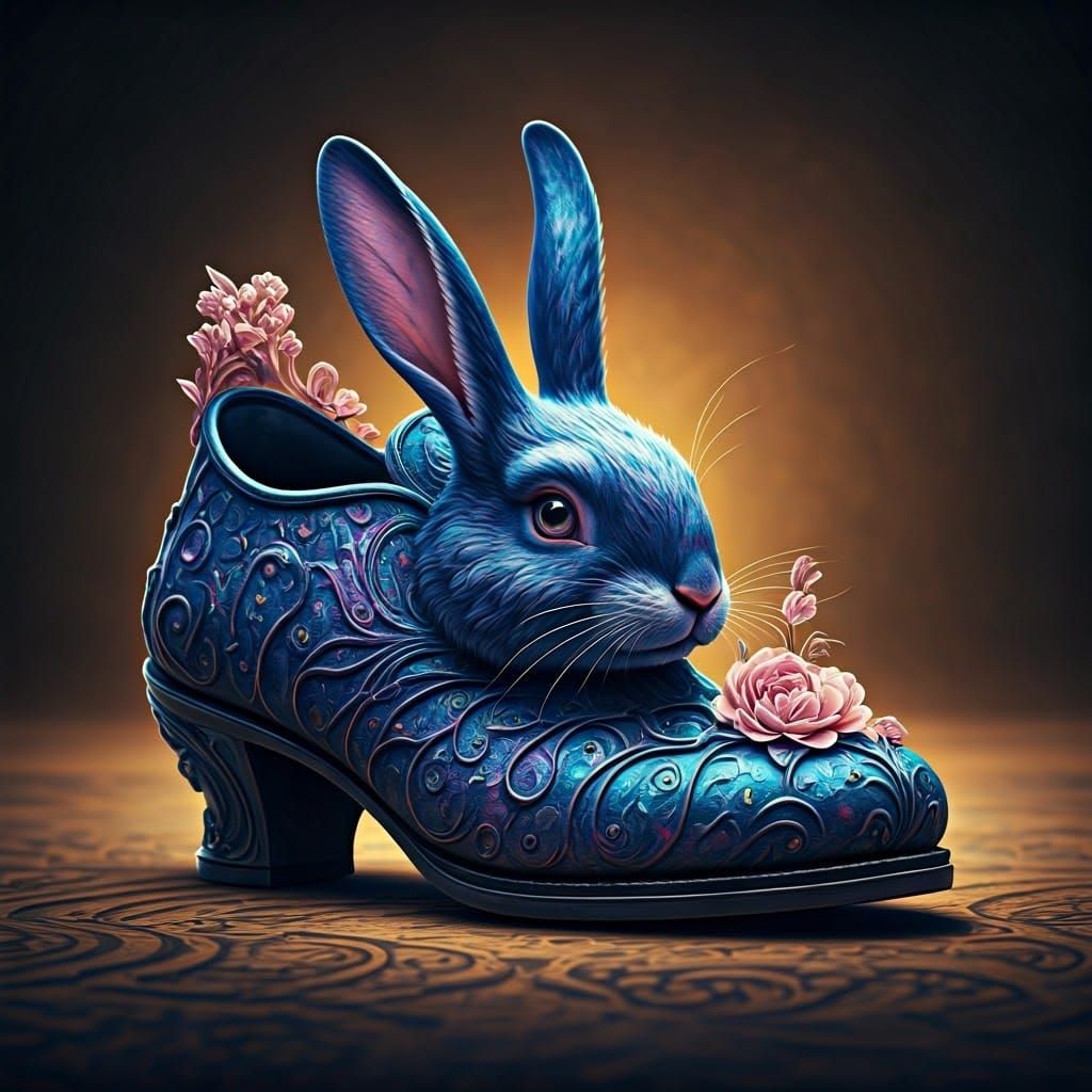 A striking picture of a fantasy shoe designed with rabbit-like features. The image presents vibrant, complementary colors and a matte painting style, reminiscent of surreal, photorealistic concept art.