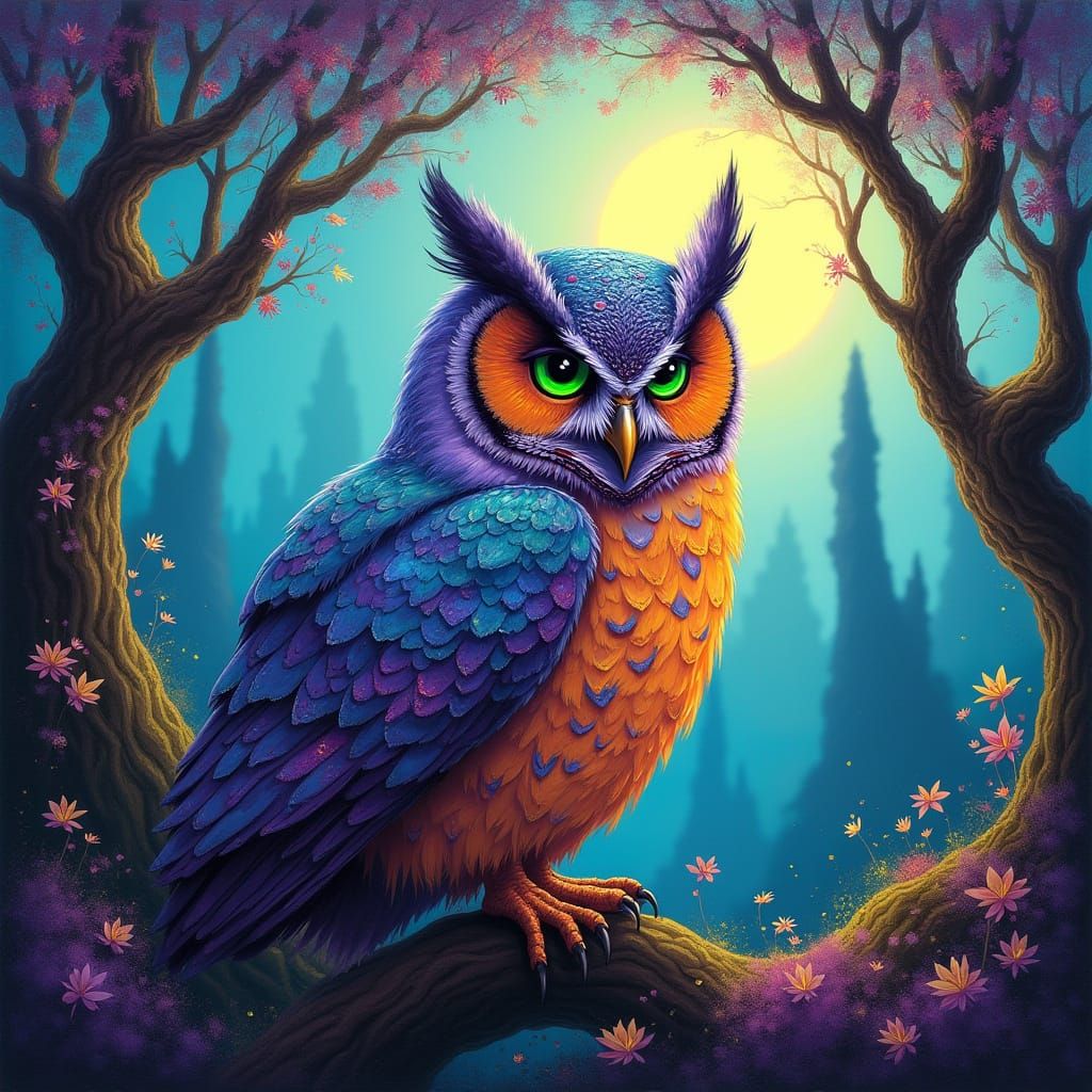 This enchanting image features a vibrant owl with piercing green eyes, surrounded by mystical trees and a whimsical fairytale landscape, blending graffiti and street art styles with bold brushstrokes and deeply saturated colors.