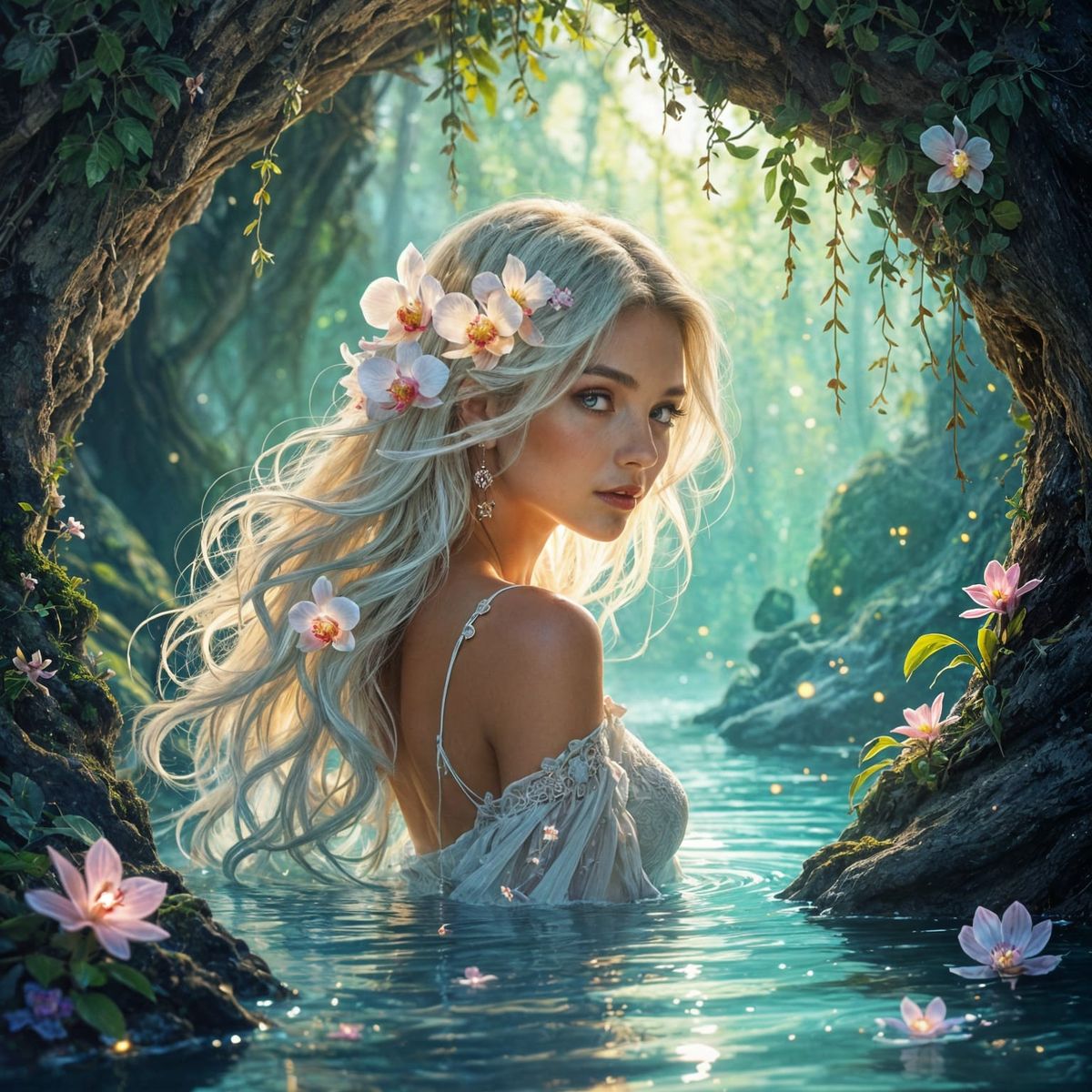 A beautiful woman with bioluminescent hair stands in a grotto. The scene features glowing flora and fauna with soft, ethereal light filtering through the canopy, in the style of art nouveau.