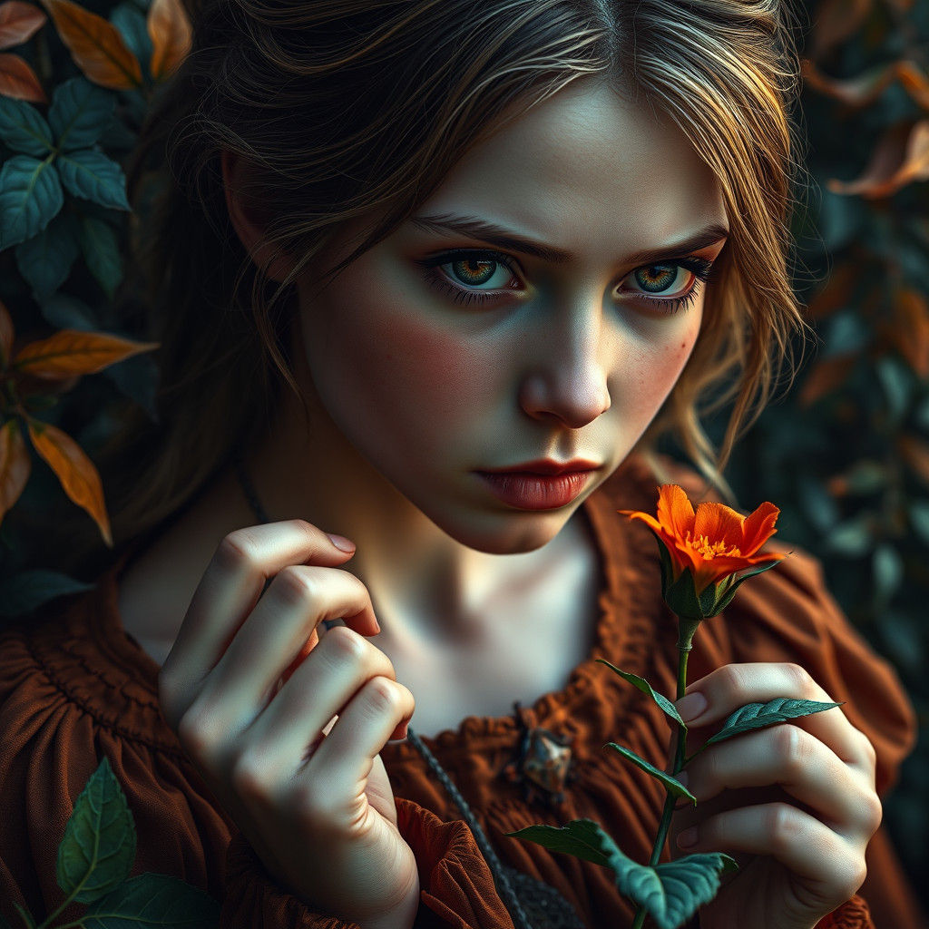 A striking picture of a young woman picking a russet flower in her garden. The image features rich, earthy tones and intricate details, rendered as photorealistic digital art in 8k resolution.